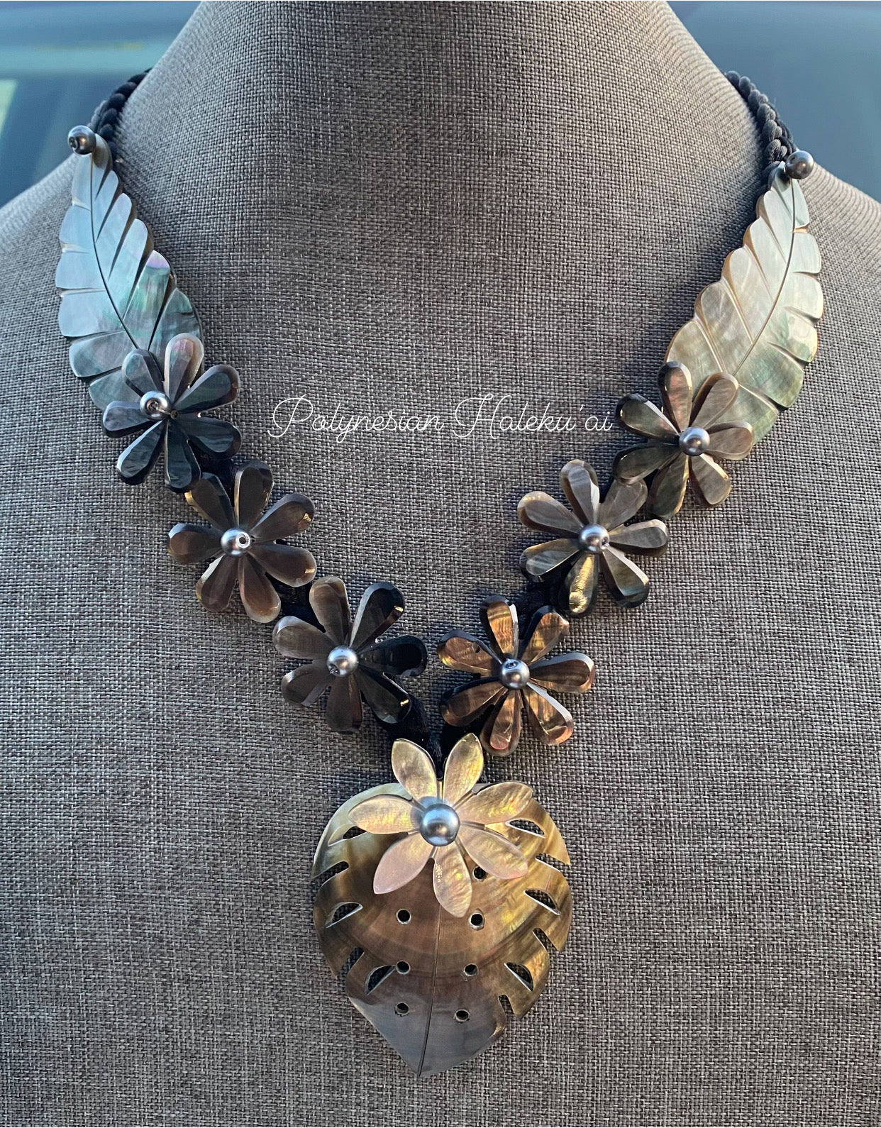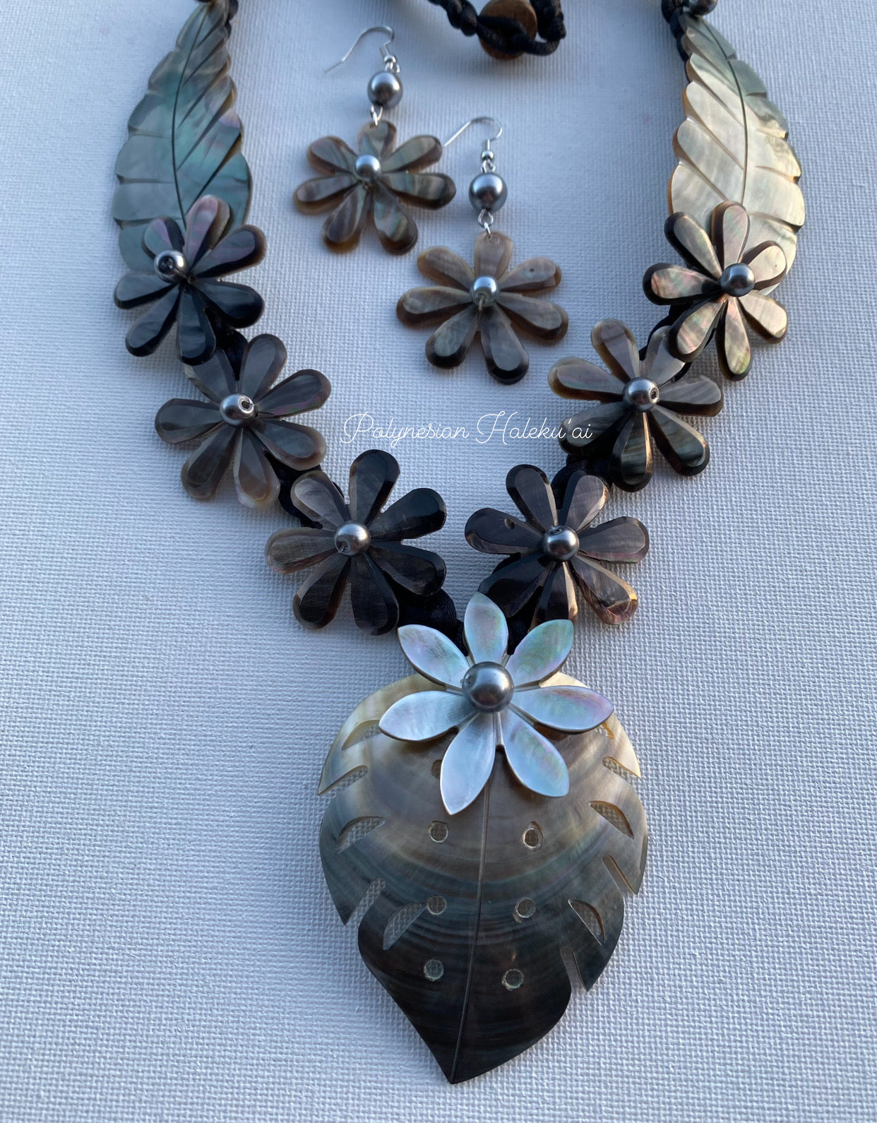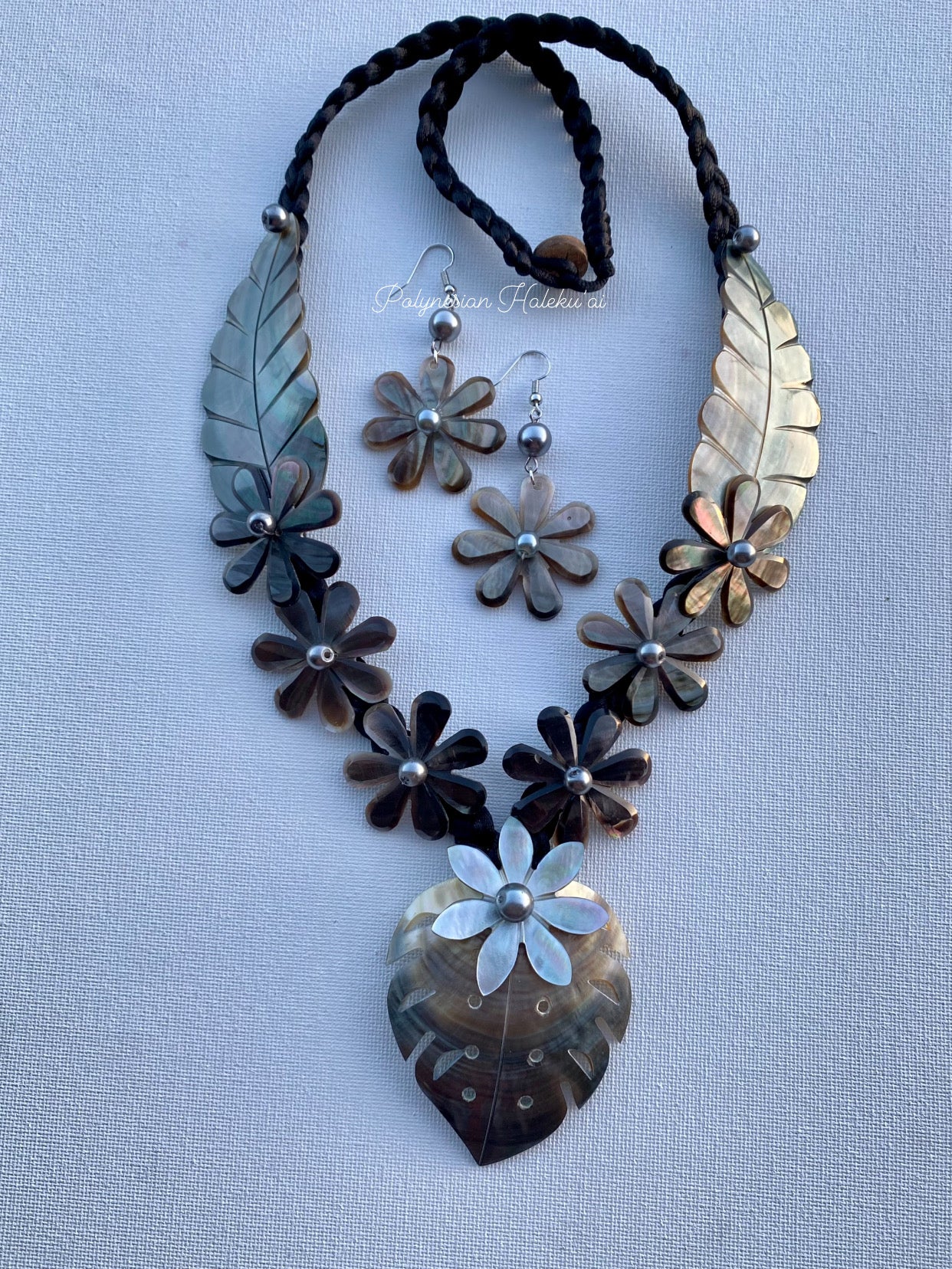 Combinations of mother of pearl shells put together to create this unique necklace with matching earrings.